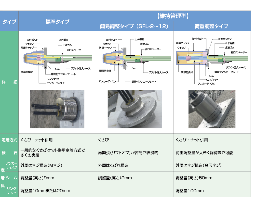 頭部構造は、標準タイプ、簡易調整タイプ、荷重調整タイプの3種類があり、維持管理する頻度や荷重調整量、保全対象の重要度等を総合的に判断し選択します。