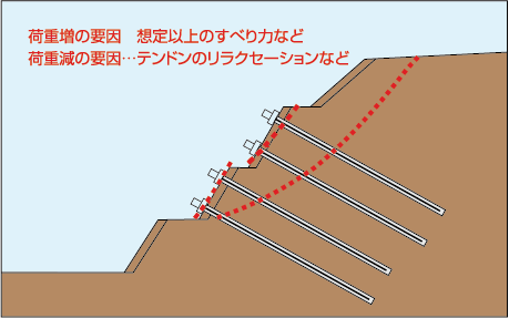 アンカーの残存引張り力は、アンカー施工後に変化します。供用期間中にアンカーの性能が低下する恐れのある場合は、残存引張り力の調整を行う必要があります。